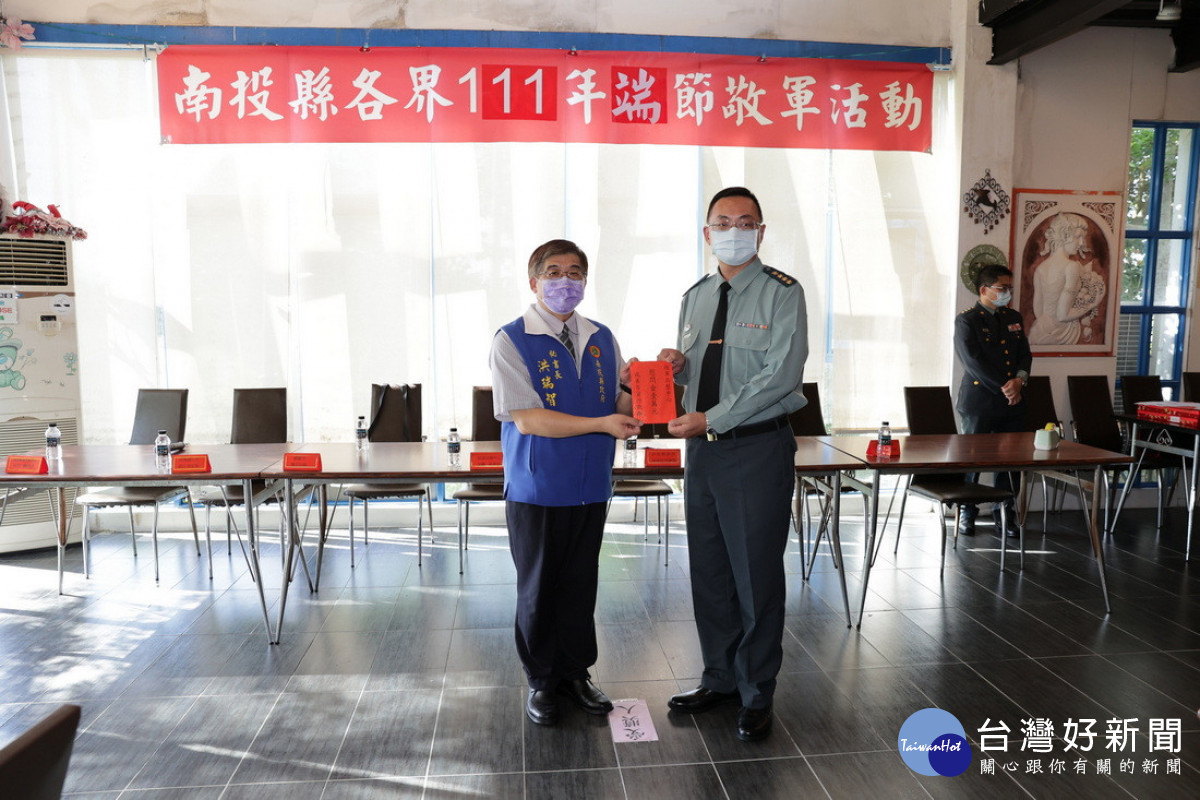端午節將至,縣府結合南投縣軍人之友社、南投市等鄉鎮市公所、南投縣工業會及廣隆光電等數個企業團體等組成敬軍團,1日在南投市赤腳精靈景觀餐廳舉辦端午節敬軍活動,致贈陸軍兵工整備發展中心、軍備局209廠、南投縣後備指揮部、南投憲兵隊等單位加菜金,感謝國軍在疫情期間及每次防救災時,努力為南投縣保家衛民。