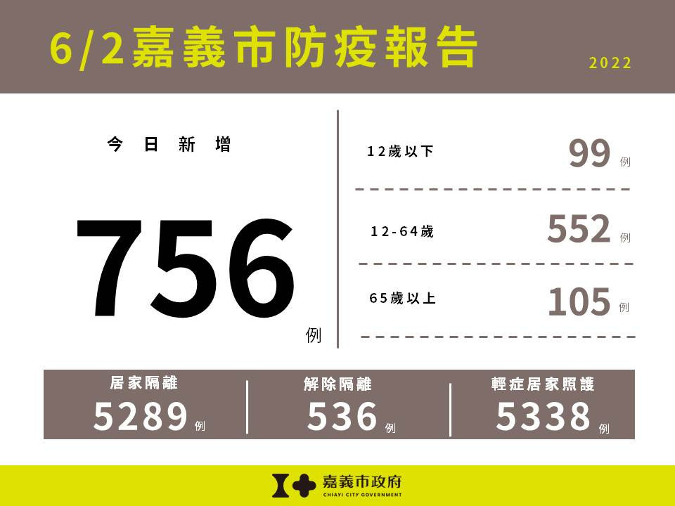 中央流行疫情指揮中心今(6/2)日公布全國本土新增76967例,嘉義市新增756例確診個案,包含12歲以下99例,12-64歲552例,65歲以上105例。嘉義市目前居隔5289人,解隔536人,輕症居家照護人數5338人。