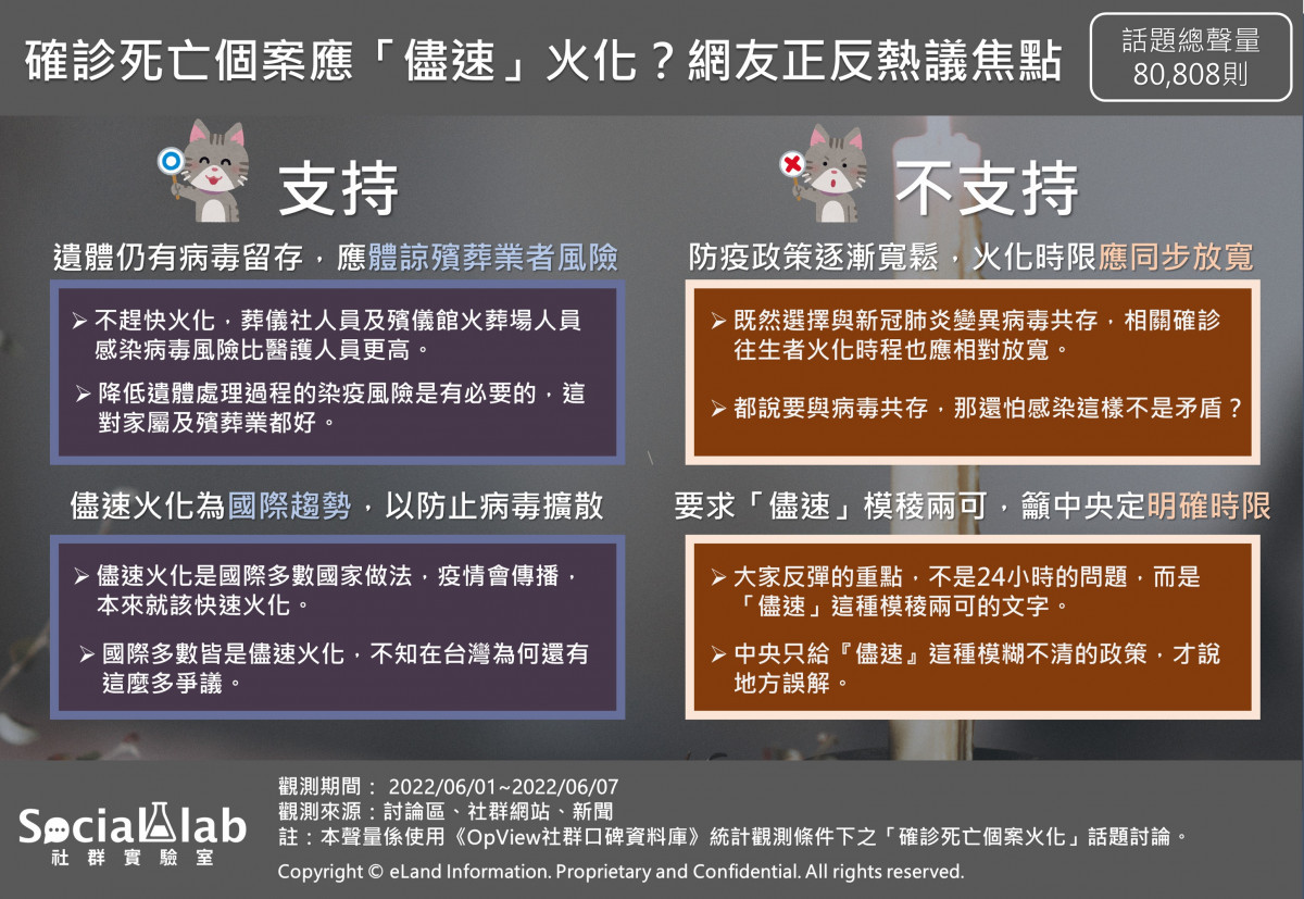 關於確診死亡個案的遺體是否應「儘速」火化,許多網友存有不同看法。支持儘速火化的網友主要仍是基於「防疫」考量,例如從「殯葬業者」的角度出發,由於病毒在個案過世後可能仍有殘存,一旦允許遺體久置,從業人員的染疫風險則可能大增,故說道「不然是要放幾天、放哪裡?難道不該替殯葬業者減低風險?」。另外也有網友從「國際趨勢」的角度分析,提及「疫病死亡24小時火化是對的政策,巴西也是這樣,在中國那處理更快,那是沒辦法的事」,主要擔心確診遺體可能造成病毒傳染的風險。