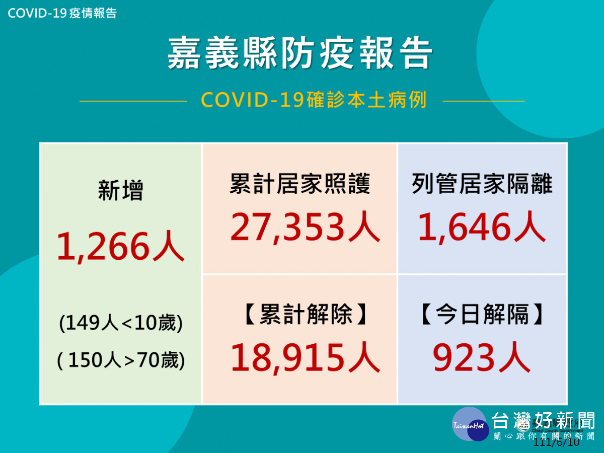 嘉義縣6/10公布1266人確診,其中有症狀232人,無症狀1034人。年齡介於4個月-99歲,10歲以下149人,70歲以上150人。累計全縣10歲以下染疫幼童3047人,70歲以上也2501人。目前居家隔離1646人,輕症居家照護8438人。