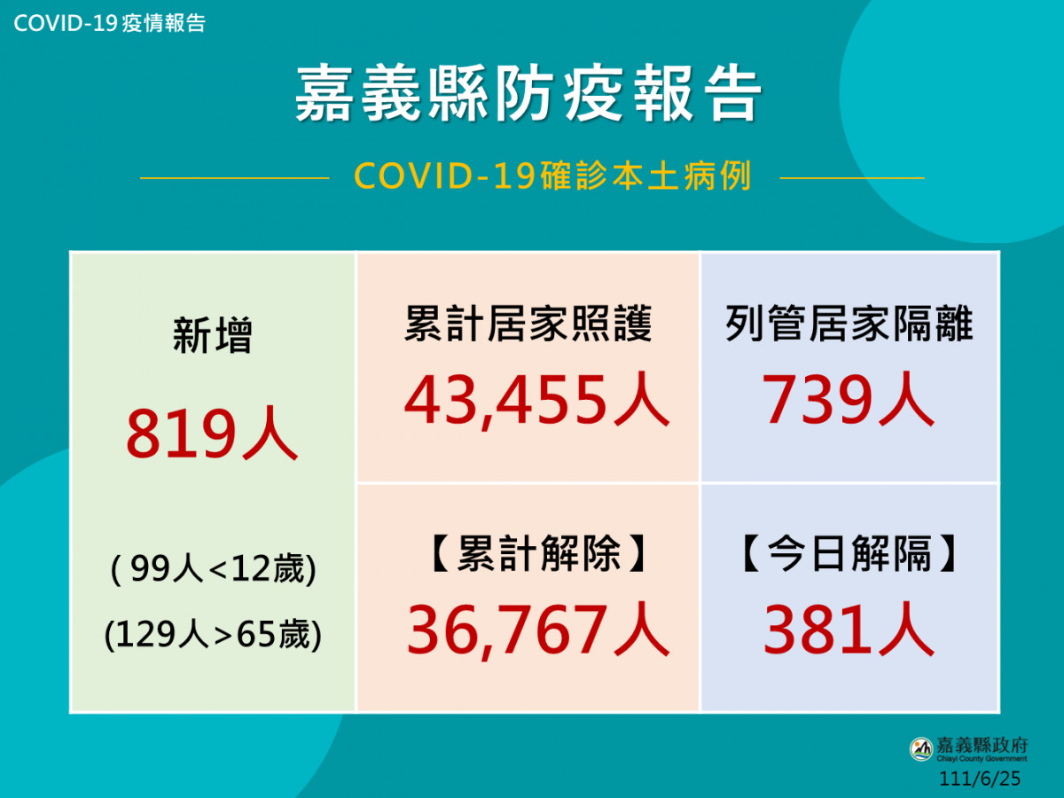 嘉義縣今公布819人確診,其中有症狀164人,無症狀655人。年齡介於4個月到95歲,12歲以下99人,65歲以上129人。累計全縣12歲以下染疫幼童5673人,65歲以上也有6315人,目前居家隔離739人,輕症居家照護6688人。